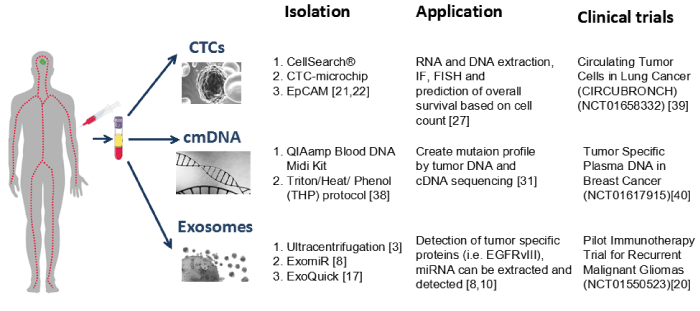 | Figure 1: Overview of biofluid-based circulating tumor molecules. For each tumor-derived circulating biomarker, several commonly accepted isolation methods are listed with their application; and ongoing clinical trials are also included to validate their applicability. |