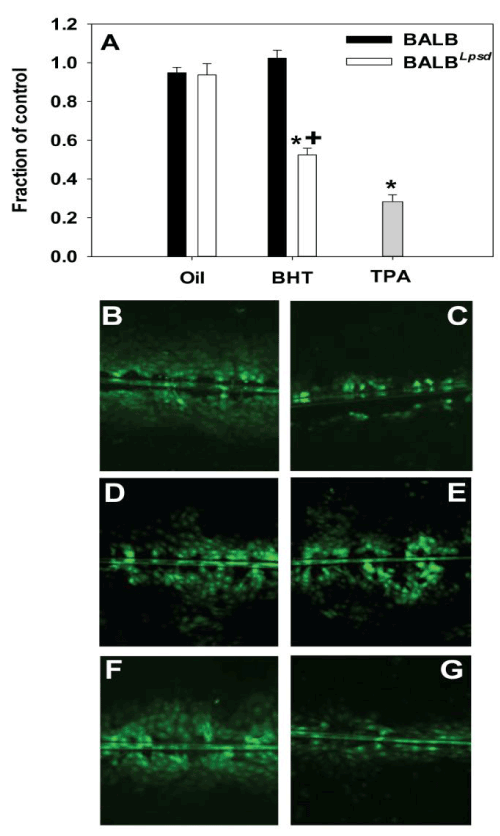 | Figure 3: Inhibition of GJIC after a 4 h exposure to BALF is both treatment and strain dependent. A) Graph of quantitated images from both BALB and BALBLps-d BALF-treated C10 cells following the SL/DT assay using Lucifer Yellow fluorescent dye. N=4-7 per treatment group, repeated twice. Data were normalized to the medium control and presented as mean + SEM for fraction of control. *, P<0.05 for BHT compared to oil treatment groups; +, p<0.05 for BALB versus BALBLps-d mice. More inhibition is evident in cells treated with BALF from BHT-treated BALBLps-d (G) compared to all other BALF treatments. (B) C10 cells treated with serum-deprived media alone as control; (C) C10 cells treated with TPA as a known inhibitor of GJIC. (D) C10 cells treated with BALF from oil-treated BALB mice; (E) C10 cells treated with BALF from BHT-treated BALB mice; (F) C10 cells treated with BALF from oil-treated BALBLps-d mice; (G) C10 cells treated with BALF from BHT-treated BALBLps-d mice. Magnification is 100X. |