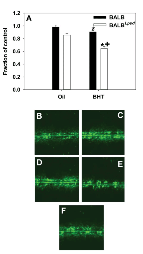 | Figure 4: Inhibition of GJIC after a 24 h exposure to BALF is both treatment and strain dependent. (A) Quantitation of SL/DT assay demonstrating significant differences between strain BALF effects in the C10 cells following the SL/DT assay using Lucifer Yellow fluorescent dye. N=3-5 per treatment group, repeated twice. Data were normalized to the medium control and presented as mean + SEM for fraction of control. *, P<0.05 for BHT compared to oil treatment groups; +, p<0.05 for BALB versus BALBLps-d mice. (B) Image of C10 cells treated with BALF from oil-treated BALB mouse; (C) Image of of C10 cells treated with BALF from BHT-treated BALB mouse; (D) Image of C10 cells treated with BALF from oil-treated BALBLps-d mouse; (E) Image of C10 cells treated with BALF from BHT-treated BALBLps-d mouse; (F) Image from C10 cells treated with serum-deprived media alone as control. Magnification is 100X. |