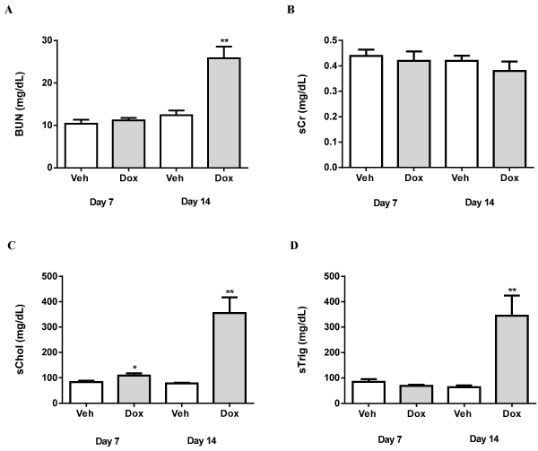 | Figure 1: Serum biomarker (blood urea nitrogen, BUN; serum creatinine, sCr; serum cholesterol, sChol; serum triglycerides, sTrig) concentration changes in male Sprague-Dawley rats administered Vehicle (Veh, 0.9% saline) or Doxorubicin (Dox, 5 mg/kg/dose) and samples collected on study days 7 and 14. Values significantly different from vehicle control are indicated as **p<0.01 or *p<0.05. |