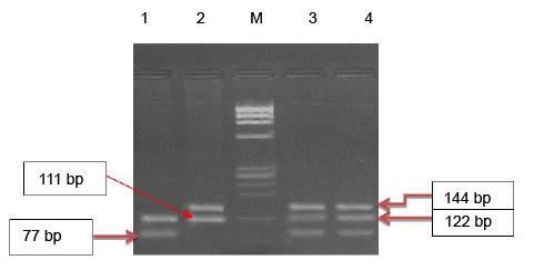 | Figure 2a: A 3% agarose gel showing HinfI digested PCR products of the PON1-55 and PON1-192 polymorphisms. Lane (1): showed 122 bp of LL genotype of PON1-55 and 77 bp of RR genotype of PON1-192. Lanes (2): showed 144 bp of MM genotype of PON1-55 and 111 bp of QQ genotype of PON1-192. Lane (3, 4): showed 144 and 122 bp of LM genotype of PON1-55 and 77 bp of RR genotype of PON1-192.M: (PhiX174 DNA/HaeIII digest) |