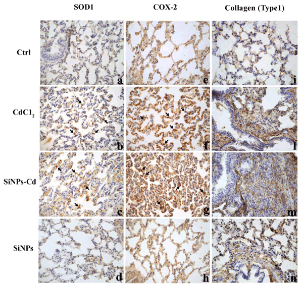 | Figure 2: SOD1, COX2, and Collagen (Type I) expression in lung. Immunohistochemical labelling for SOD1 (a–d), COX2 (e–h), and Collagen (i–n) in pulmonary tissues of control (a, e and i), CdCl2- (b, f and l), SiNPs- Cd- (c, g, m), and SiNPs-treated rats (d, h, n), 7 and 30 days after i.t. exposure. SOD1 was clearly detectable after both CdCl2 and SiNPs-Cd, still at 7 and lasting until 30 days (b and c, respectively), mainly localized at alveolar macrophages level (arrows). COX2 expression was markedly enhanced at 7 as well as at 30 days, after both CdCl2 and SiNPs-Cd (f and g) compared to control, primarily detected in the alveolar wall, both at capillary and epithelial levels (arrows). The Collagen labelling changes appeared evident particularly 7 and 30 days after both CdCl2 and SiNPs-Cd (l and m, respectively) and 30 days after SiNPs (n) exposure, with a strong stromal fibrogenic reaction characterized by a diffuse enhanced collagen storage (ln). Objective magnification: 40 x (a-n). |