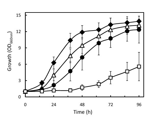 | Figure 3: Growth of R. opacus PD630 on high glucose concentrations in flask cultures. Glucose concentrations tested in defined medium containing 1.4 g l-1 (NH4)2SO4 were 200 g l-1 (●), 250 g l-1 (□), 300 g l-1 (♦) and 350 g l-1 (Δ). Initial inoculum density was adjusted to obtain an OD660 of 1.0. The error bars represent the standard deviation of three separate replicates of each experiment. |
