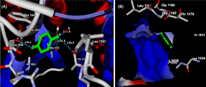 | Figure 1: Predicted bonded and non-bonded electrostatic interactions between Polyaniline and Rhodosporidium toruloides D-amino acid oxidase (A) Predicted bonded interactions (blue dashed lines) between PAni (green) and Asp 1036 and Thr 1179 of RtDaao and (B) predicted non bonded electrostatic interactions between PAni (green) and RtDaao. |