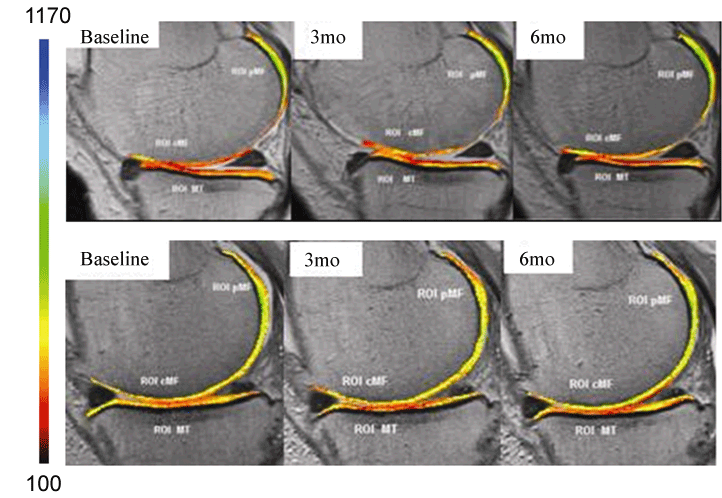 | Figure 1: Many of the patients in this study had areas of denuded bone, as shown in the example above with a knee with KL score of 2 (Top). Another subject also with KL score of 2 but with no gross loss of cartilage is shown (Bottom). Both sets of images show little longitudinal change in dGEMRIC index over 6-mo in the active arm. |
