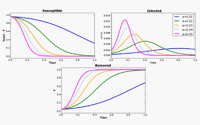 | Figure 1: SIR Analysis of a Hypothetical Epidemic Approximated by Y and dY/dt. (top left ) Susceptible (S) approximated by Total – Y – dY/dt, (top right) Infected (I) approximated by dY/dt and (bottom) Removed (R) approximated by Y – dY/dt. The non-linear parameter a was varied from 0.01 to 0.05. |