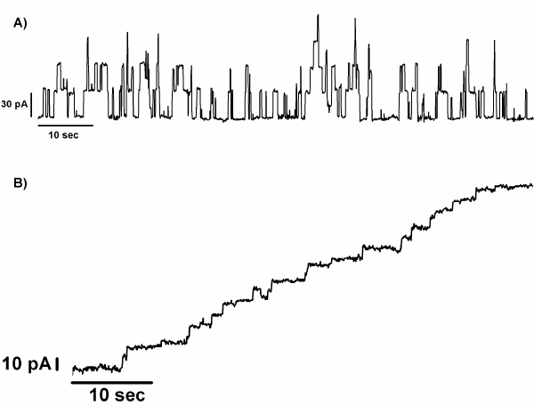 | Figure 7: Protein incorporation. A) gA channel current trace in 8x8 BLM array formed across a double-sided n-hexene modified ETFE partition. The BLM array were formed in 1N HCl adjusted to pH 1 using a 50 mg/ml DPhPC/ decane bilayer forming solution with gAadded in a 1:107 ratio. B) α-hemolysin channel current trace with experimental details as in (A) except that buffer was replaced with phosphate buffered saline solution (PBS). After BLM array formation 10μl α-hemolysin was added to the cis chamber and channel activity recorded as described in the Materials and Methods section. |