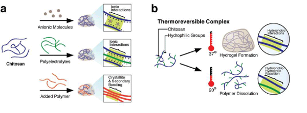 | Figure 2: Schematic representation of chitosan based hydrogel networks derived from different physical associations: (a) networks of chitosan formed with ionic molecules, polyelectrolyte polymer and neutral polymers; (b) thermoreversible networks of chitosan graft copolymer resulting semi solid gel at body temperature and liquid below room temperature. (from ref [13] with permission). |