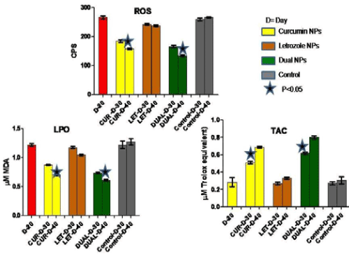 | Figure 12: Serum oxidative stress markers including ROS, LPO, and TAC levels in mice with endometriosis before and after treatment with NPs. The red bar depicts mice with endometriosis on D20. The effect of various NPs in different groups on various days is shown. |