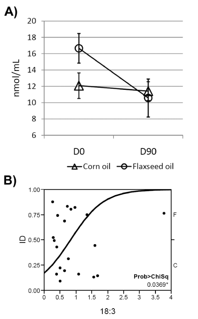 | Figure 4: Plasma ALA levels between start and end of study. Plasma profiles of a-linolenic acid (18:3, ALA) were measured at start (day 0, D0) and end of study (day 90, D90) for both groups (flaxseed oil supplementation, F; corn oil supplementation, C). A) ALA group averages are indicated for both time-points, with no significant changes for either group as determined by paired t-tests. Error bars represent standard error. B) Logistic fit indicated significance for the D90/D0 ALA ratio as a predictor for group classification. |