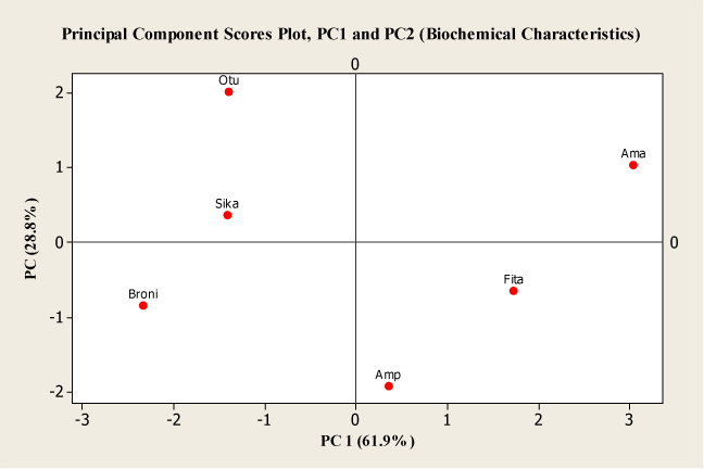 | Figure 2:Sample score plot for the principal component analysis of starches and sugars (biochemical characteristics) of traditional and improved cassava varieties. |