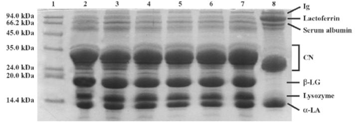 | Figure 1: Sodium dodecyl sulfate-PAGE of jenny and human milk proteins. Lane 1 is protein marker; lanes 2, 3, 4, 5, 6, and 7 are jenny milk samples for 15, 30, 60, 90, 120, and 150 days postpartum, respectively; lane 8 is a human milk sample for 60 days postpartum. Reasonable levels of casein, ß-lactoglobulin, lysozyme and α-lactalbumin, and lower levels of immunoglobulins, lactoferrin and serum albumin characterize jenny milk vs. human milk (3,44,52). The SDS-PAGE was under reducing conditions (3), using a Mini-Protean 3 gel electrophoresis apparatus with a 4% acrylamide stacking gel and a 16% separating gel. A mark protein ladder, with proteins of 14.4 to 94 kDa, was used as a molecular weight standard. A human milk sample (at d 60 postpartum) was obtained from a healthy donor. Current was applied at a constant voltage of 80 V until samples entered the separating gel, and voltage was increased to 120 V. Gels were stained with 0.1% Coomassie Brilliant Blue R-250 in 10% acetic acid and 40% methanol, and destained overnight in 10% acetic acid and 10% methanol with 2 buffer changes (3,89). |