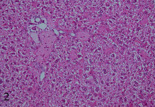 | Figure 2: A section in the liver drenched Commercial pear drink at dose (0.8 mg/kg b.w./day) for 3week showing vacuolar degeneration and hepatocellular necrosis associated with edematous which surrounded by aggregation of inflammatory cells, proliferation and dilation of bile duct, signs of fibrosis could be seen (Hx&E x200). |