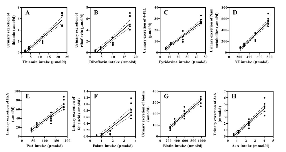 | Figure 2: Regression and 95% CI of oral dose and urinary excretion of vitamin B1 (A), vitamin B2 (B), vitamin B6 (C), niacin (D), pantothenic acid (E), folate (F), biotin (G) and vitamin C (H) [23]. Values are individual points of six subjects in each dose. 4-PIC signifies 4-pyridoxic acid, a catabolite of vitamin B6 vitamers, the Nam metabolites does the total amount of nicotinamide metabolites, MNA, 2-Py and 4-Py, the PaA does pantothenic acid, and the AsA does ascorbic acid. |