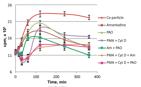 | Figure 7: Uptake of 45Ca-apatite particles in presence or absence of PMA and Cyt D was clathrin-dependent. Jurkat cells were treated with the specified chemicals in presence of 45Ca-apatite. Samples were collected at indicated time points after 3 times washing with ice cold PBS, followed by 5 min incubation with 10 mM EDTA in PBS and two times rinsing with ice cold PBS. Samples were immediately processed for radioactivity measurement. Error bar, SEM (n=4); Am, Amantadine; PAO, phenylarsine oxide. Uptake of 45Ca-apatite particles in presence or absence of PMA and Cyt D was clathrin-dependent. Jurkat cells were treated with the specified chemicals in presence of 45Ca-apatite. Samples were collected at indicated time points after 3 times washing with ice cold PBS, followed by 5 min incubation with 10 mM EDTA in PBS and two times rinsing with ice cold PBS. Samples were immediately processed for radioactivity measurement. Error bar, SEM (n=4); Am, Amantadine; PAO, phenylarsine oxide. |