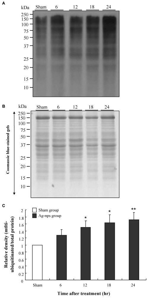| Figure 2: Changes in mitochondrial ubiquitinated proteins expression in liver tissues at various time points following i.p. injection of Ag-nps. A: Mitochondrial ubiquitinated proteins expression based on Western blot analysis. B: Coomassie blue-stained gels demonstrating equal loading of the samples. C: The relative densities were normalized from part A to the total amount of protein measured from part B. The experiments were performed as described under Material and Methods. Empty columns represent sham groups while filled columns represent Ag-nps treatment groups. Molecular weight size markers (kDa) are indicated at the left. Values were means ± SD (n=8), *p<0.05 and **p<0.01 compared to sham group. |
