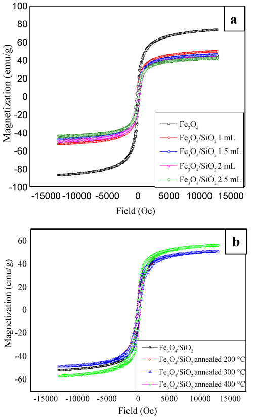 | Figure 9: The magnetization curves for both Fe3O4 nanocube and Fe3O4/SiO2 nanocube with different TEOS amount (1, 1.5, 2, and 2.5 mL) measured by VSM at 300 K in case of (a) after 4 month of exposure to air and (b) after annealed the sample at different temperatures in presence of H2 gas. |