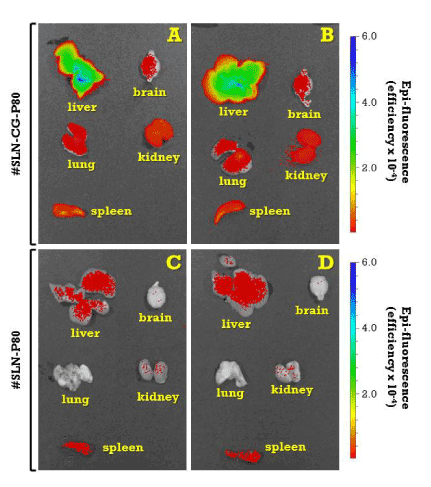 intraperitoneal administration. Organs are from mice treated with fluorescent nanoparticles (#SLN-CG-P80) (A, B) or blank, control nanoparticles (#SLN-P80) (C, D). Colour bar on the right side indicates the signal efficiency of the fluorescence emission coming out from the organ. For nanoparticle identification codes, composition and preparation procedure, please refer to Table 1 and experimental section. |