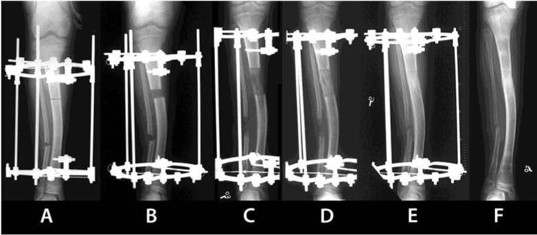 | Figure 3: Radiological representation of the distraction osteogenesis technique. A. Osteotomy is performed after the application of the external fixator; B. Initial phase of the distraction procedure. C. Elongation of the bone; D. New bone tissue formed at the distraction site; E. Radiological evidence of bone mineralization during the consolidation phase; F. Final consolidation of the lengthened bone and removal of the fixator. |