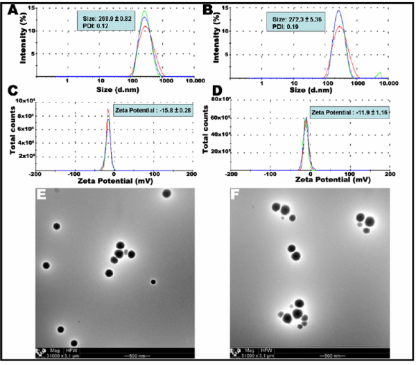 | Figure 4: Physicochemical characterization of fluorescent PLGA NPs. (A, C, E)size distribution, zeta potential, and morphology (TEM, original magnification 31.000x) of 6-coumarin loaded PLGA nanoparticles. B, D, F) size distribution, zeta potential, and TEM (original magnification 31.000x) of cetuximab conjugated 6-coumarin loaded PLGA nanoparticles. |
