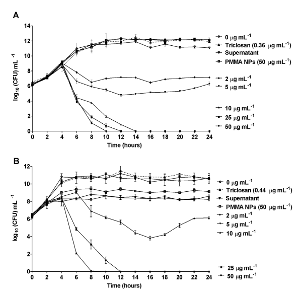 | Figure 5: Antibacterial properties of TPA NPs. Killing curves of (A) E. coli and (B) S. aureus grown in different concentrations of PTA NPs (2 to 50 μg mL-1) for 24 h at 37°C. Growth was determined by viable counts and is expressed in colony-forming units (CFU). Untreated bacteria and unloaded NPs (i.e., PMMA NPs) tested at a concentration of 50 μg mL-1 served as controls. Dashed lines (in A and B) represent the killing curves of E. coli (A) and S. aureus (B) exposed to free triclosan at concentrations of 0.36 and 0.44 μg mL-1, respectively. The triclosan concentrations tested in A and B were determined as the maximal concentrations of triclosan released from PTA NPs in the presence of E. coli and S. aureus, respectfully (see Figure 7). The supernatant curve line refers to E. coli (A) and S. aureus (B) grown in the supernatant of TSB or TSB-Glu previously incubated with PTA NPs (50 μg mL-1) for 24 h at 37°C. Error bars represent the standard deviation of three independent experiments conducted in triplicate. |
