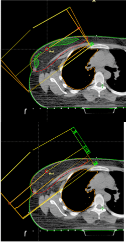 | Figure 2: Showing axial CT simulation images. A: Physical wedge (superior) showing Maximum target dose in green occupying large volume of breast PTV in red. B: Field in field (inferior) resulted in complete disappearance of Maximum target dose from breast PTV. |
