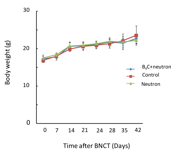 | Figure 3: Effects of B4C-mediated BNCT on body weight. Nude mice carrying SAS tumors received 50 μl of 250 ppm B4C solution intratumorally. Ten minutes later, tumors were exposed to thermal neutrons. The experimental groups were as follows: untreated control, neutron only, and B4C-mediated BNCT. After BNCT, body weight was measured during the experiment n=5. |