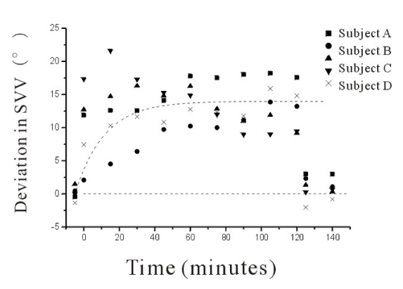 | Figure 3: Temporal changes in SVV measured during lighted conditions in subjects lying down on their left sides. Data from 5 representative subjects are shown. SVV deviated almost immediately after the subjects laid down, plateauing in about 30 minutes. |