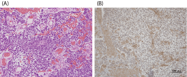 | Figure 3: Pathological findings of glioblastoma. (A) Pathological findings on the tumor removed in 2005. H&E staining demonstrated necrosis, mitosis, microvasucular proliferation and palisading figures. The histological diagnosis was glioblastoma (× 100). (B) Immunohistochemical staining of cells for MGMT shows strong immunoreactivity (×100). |