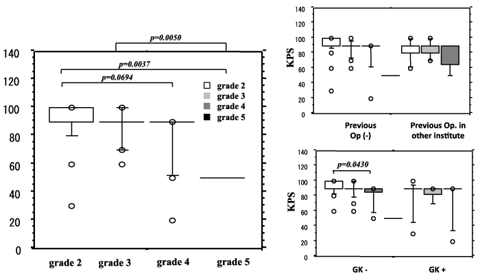 | Figure 5: Relationship between postoperative Karnofsky performance status score (KPS) and tumor grade according to the proposed new classification system for craniopharyngiomas. Postoperative KPS decreases significantly with an increase in tumor grade. Mean postoperative KPS is 88.9 ± 13.3 for grade II (n=38), 87.6 ± 9.1 for grade III (n=45), 81.9 ± 19.7 for grade IV (n=16), and 50 for grade V (n=1). Gamma knife (GK) treatment (right lower panel) (preoperative; n=15, postoperative; n=13, total; n=28) or surgery in other institution (right upper panel: previous Op. in other institute; n=14) does not influence postoperative KPS score. GK+;GK treatment before or after surgery, GK- ; No GK treatment, Previous Op. in other institute; 1st operation done in other institution, Previous Op. (-); primary surgery done in our institution. |