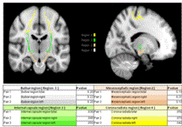 | Figure 1: MRI coronal (left) and sagittal view (right). Fractional anisotropy of the PT was analyzed, measured and compared in 4 regions of interest (ROI) named as bulbar (ROI-1, in white), mescencephalic (ROI-2, brown), posterior limb of internal capsule (ROI-3, green)) and Corona Radiata (ROI-4, yellow). Differences between baseline and after stem cells transplantation MRI-FA are shown. Only ROI 3 and 4 that are located close to the site of transplantation showed statistically significant increment in FA in comparison to baseline FA. In the corona radiata, increase in FA was found when left and right sides were measured and compared in total (p=0.05), FA in this ROI showed statistically significant increment only in left side(p= 04). |
