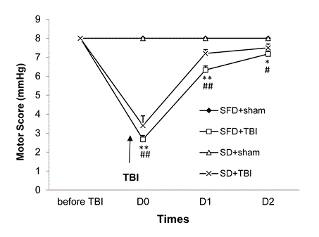 | Figure 3: The effect of dietary soy on the neurologic outcome using motor score of veterinary coma scale in rats with severe traumatic brain injury (TBI), before trauma, on trauma day (D0), and first (D1) and second (D2) days post-trauma (n= 6 in each group). Data are presented as mean ±SEM. **P<0.01: significant difference of SFD + TBI group with SFD + sham group on D0 and D1. ##P<0.01: significant difference of SFD + TBI group with SD + sham group on D0 and D1. * P<0.05: significant difference of SFD + TBI group with SFD + sham group on D2. #P<0.05: significant difference of SFD + TBI group with SD + sham group on D2. SFD: soy- free diet; SD: soy diet. |