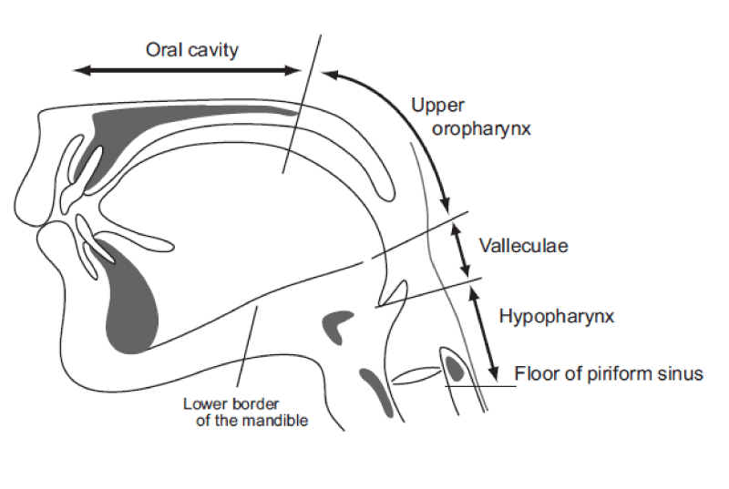 | Figure 1: Location of the leading edge of the barium was defined by five anatomical regions: (1) the oral cavity; (2) the upper oropharynx behind the fauces but above the inferior border of the mandible; (3) the valleculae below the inferior border of the mandible but above the hypopharynx; (4) the hypopharynx below the epiglottis but not reaching the floor of the piriform sinus; and (5) the floor of the piriform sinus. |