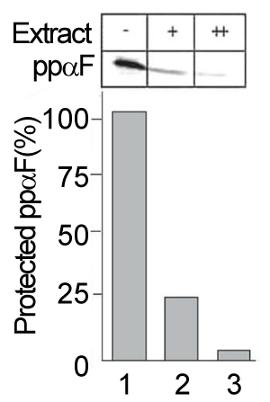 | Figure 2: Yeast microsome salt extract fraction contains protein-unfolding activity. The salt extract (-) is shown as a trypsin protected control band and exhibited at 100%. (+), 50 μg; (++), 100 μg of crude extract. The protected bands were detected by immunoblotting using polyclonal antibody against αF and visualized by ECL-plus. |