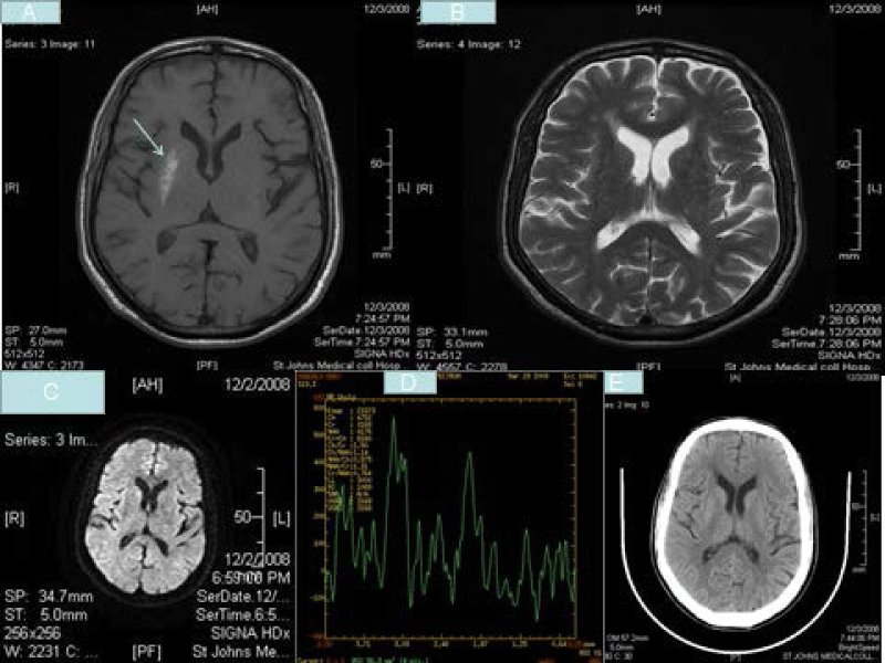 | Figure 1: T1W axial image (A) showing striatal hyperintensity(arrow),T2W axial images(B) showing hypointensity, Diffusion weighted images(C) showing no restriction, magentic resonance spectroscopy(D) showing reduced NAA peak and CT axial images(E) showing hyperdensity in striatum (MRI was done by General Electric HBX, 1.5 Telsa machine, 2007 model with 4.3 version software). |