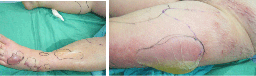 | Figure 1: A 39 year-old female with nephrotic syndrome presented with necrotizing fasciitis caused by Serratia marcescens. The presentation of skin lesions revealed an erythromatous bulla in her skin. The bulla was heterogeneous with serous and sanguineous characteristics. |