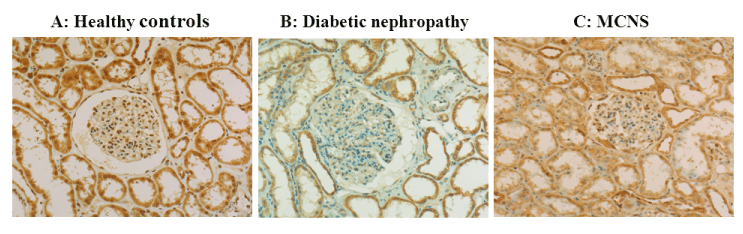 | Figure 4: Immunostaining of the MAS receptor in kidney specimens from a healthy control (A), a patient with diabetic nephropathy (B), and a patient with minimal change nephrotic syndrome (C). The MAS staining was weak in the specimen from the DN patient (B). |