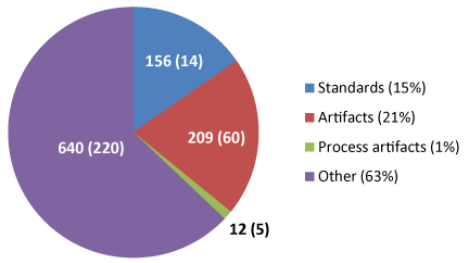 | Figure 6: Ion-feature totals per biochemical class or type. Pie chart is based on the 299 approved biochemicals detected in all three replicates of the Plasma B sample. 640(220) designates 640 total ion-features detected from 220 named and unknown biochemicals. Standards are isotopically labeled compounds spiked into every sample. Artifacts are defined as compounds detected in both the plasma samples and the water process blank where the plasma sample did not exceed 5x the levels seen in the blanks. Process artifacts are compounds not detected in water process blank but are known products of chemistry occurring within the extracted samples. “Other” refers to detected biologically derived ion-features/biochemicals. In Legend, percentage value is percentage of total ion-features detected. |