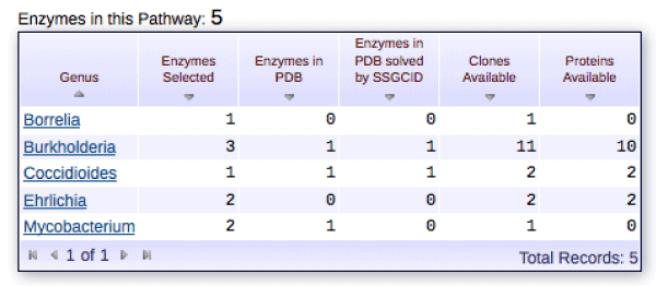 | Figure 1: Screenshot (10/21/12) of the list of genera for PWY-4981 (Proline Biosynthesis II (form Arginine) on the SSGCID-Pathway website (http://pps.sbri.org/SSGCIDTargetStatus/Pathway/PWY-4981). The metabolomic pathway contains five enzymes and SSGCID has targeted at least one of these enzymes for structure determination from this genus list of infectious disease organisms. |