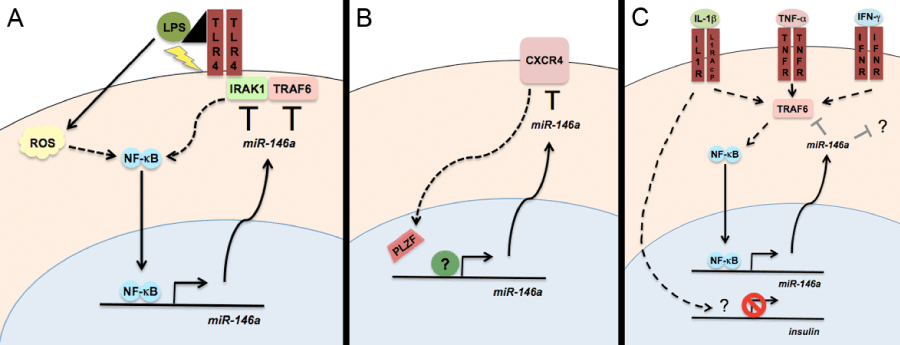 | Figure 1: Activities of miR-146a in innate immunity, cell differentiation, and energy metabolism. (A) During an innate immune response, LPS activation of Toll-like receptor 4 (TLR4) recruits IRAK1 and TRAF6, which indirectly activate NF-κB. Upon entering the nucleus, NF-κB binds to and activates the transcription of miR-146a. Irak1 and Traf6 mRNA are then targeted by miR-146a for degradation. NF-κB may also be indirectly activated through reactive oxygen species (ROS). (B) In the cell differentiation events of megakaryopoiesis, transcription factor PLZF binds to and represses the miR-146a promoter, allowing for the translation of receptor CXCR4. When normal differentiation does not occur, unknown transcription factor(s) activate miR-146a, leading to the targeting and degradation of Cxcr4 mRNA. PLZF is displaced by an unknown mechanism when miR-146a is upregulated in these cells. (C) When insulin-secreting cells are exposed to IL-1β, TNF-α IFN-γ receptormediated recruitment of TRAF6 leads to the indirect activation of NF-κB and upregulation of miR-146a. IL-1β activity also results in the downregulation of the insulin promoter. Not all targets of miR-146a are known in these cells. Solid arrow denotes direct path; dashed arrow represents indirect pathway. |