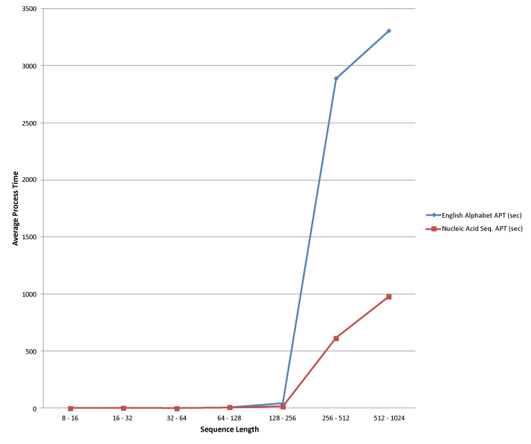| Chart 1: Average process time results. According to the results, main differences between two particular tests come up at interval six (256-512) and further. It proves that, the alphabet length is a crucial factor for the speed performance of the algorithm, since English Alphabet has 26 unique characters and a Nucleic Acid Sequence has only 4 unique characters. |
