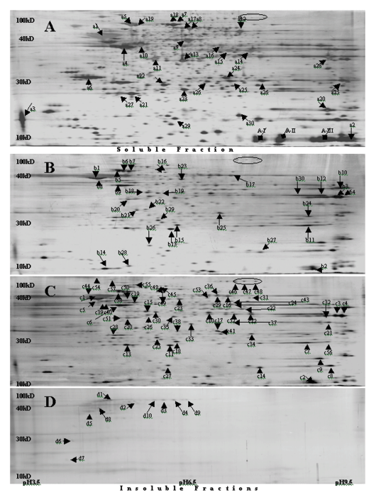 | Figure 1: Representative 2-DE maps of sequential protein extraction fractionsc from rat spinal cords. Top 30 most highly abundant proteins spots are arbitrarily marked with arrows by the order of spot staining intensity (scanned volume) in each gel. Figure 1A, soluble fraction; Figures B and C, insoluble fractions with differentenhanced extraction systems. Spots A-I, II, III (marked with solid squares) in Figure 1A are contaminated hemoglobins and excluded in our analysis. In Figure 1C, another 30 enriched spots (two are overlapped with the top 30 most highly abundant proteins) are marked, which are highly expressed in the insoluble fractions. Elliptical areas show representative insoluble-protein-enrichment effect in enhanced fractions B and C. Gel size: 245 x 180 x 1 mm3 (13% T, 3% C). Silver staining. |