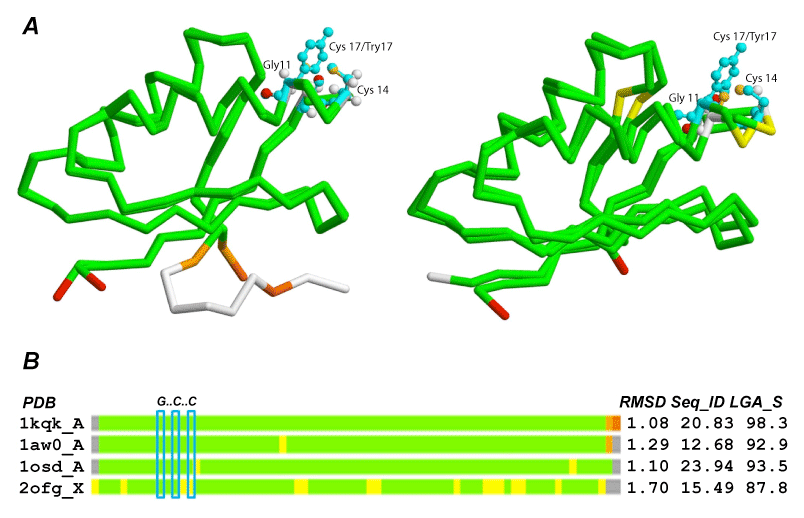 | Figure 4: Structural superposition of the model for protein 11238_88 and coppertranslocating P-type ATPases (CopA). (A.) Left, structural comparison of the model with CopA from Bacillus subtilis, PDB: 1kqk; 1st bar in (B). Right, structural comparison of the model with MerP from Cupriavidus metallidurans, PDB: 1osd; 3rd bar in (B). Positions of the key amino acids: G, C, and Y are shown in cyan rectangles as observed in PDB templates and the model constructed. (B.) Bar representation of structural deviations between four CopA proteins using created model of 11238_88 as a frame of reference. The location of the GxxCxxC motif is highlighted in cyan. The colors of the bars indicate the distance deviation between superimposed corresponding residues using the following color scheme: deviation <2Å, green; <4Å, yellow; <6Å, orange; <8Å, brown; >8Å or not aligned, red; not aligned and terminal residues not aligned, grey. |