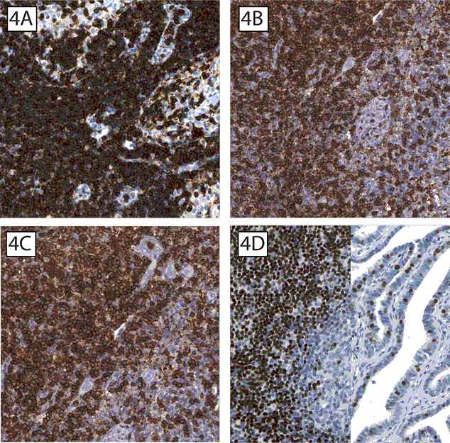 | Figure 4: Proteins specifically expressed in the hematopoietic lineage. Examples of proteins expressed in the hematopoietic lineage tissues. Among the significantly up-regulated proteins in the hematopoietic lineage tissues are well known CD markers such as PTPRC (CD-45). CD-45 is expressed in virtually all lymphoid cells, exemplified by two different antibodies from the top 100 list showing expression in lymph node tissues (A and C). The tyrosine protein kinase BTK, a protein known to play a crucial role in B-cell ontogeny, shows distinct expression in lymphoid cells of the spleen (B). The less well-characterized TCF-7, suggested as a T-cell transcription factor shows expression in lymphoid cells of T-cell areas as well as in subsets of certain epithelia including the fallopian tube (D). |