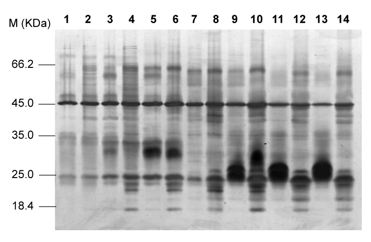 | Figure 2: SDS-PAGE analysis of secreted proteins prepared with modified sevage method. Protein standards were marked beside the gel (Molecular masses in kDa). Each lane load 8 µg proteins measuring by Bradford assay. The gel was sliver stained. Lane1, lane3, lane5, lane7, lane9, lane11 and lane13 represented the secreted proteins from EP155 and the culture time was one to seven days with 24-hour interval. Lane2, lane4, lane6, lane8, lane10, lane12 and lane14 represented the secreted proteins from EP713 and the culture time was one to seven days with 24-hour interval. |
