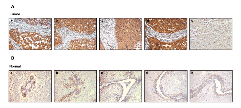 | Figure 2: The pattern of expression of KIFAP3 protein breast cancers and normal breast tissue sections. Tissue sections from TMAs stained with anti-KIFAP3 antibody. (A) This panel of five tissue sections represents breast cancer cases. Tumor sections a-d show significant overexpression of the KIFAP3 protein. Tumor section e represents a case that does not show KIFAP3 overexpression (B) This panel represents five normal breast tissue sections showing a weak expression of KIFAP3. All images were acquired at 200X magnification. |
