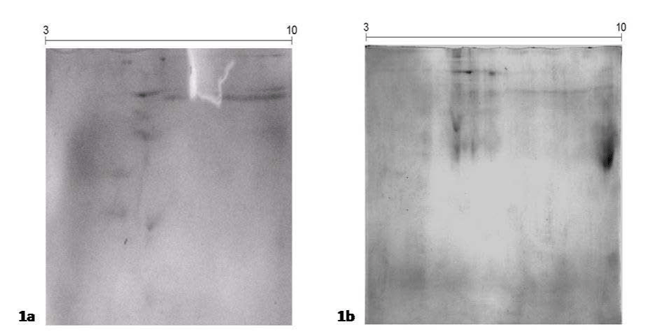 gel was stained with coomassie brilliant blue. (1b) Optimizing rehydration time: The 2-DE was performed according to the same conditions as for figure 1a with the exception of 14 hrs rehydration time rather 12 hrs. |