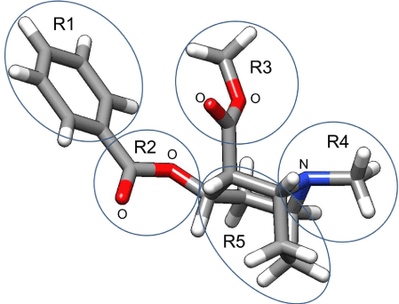 | Figure 2: According to chemical function and interatomic distances the cocaine molecule was subdivided in 5 regions: aromatic R1 (benzene ring), ester R2 (the ester directly attached to benzene), ester R3 (ester fragment attached to aliphatic ring), amine R4 and aliphatic R5 (the cycloheptane ring). |