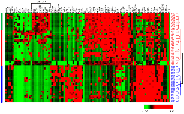 | Figure 2: Hierarchical cluster of significantly differentiating proteins: An unsupervised cluster of both FFPE biopsies and significant proteins shows clear separation among Benign (BS), Primary Melanoma (PM), and metastatic Melanoma (M) patients. A sub-cluster of proteins shows increased expression in the primary samples compared with both benign and metastatic (in brackets). Red data points indicate increased protein expression, while green indicates decreased expression. |