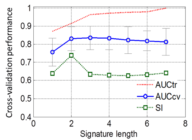 | Figure 10: Cross-validation of low and high urinary Nickel samples each having 18 observations. The diagram shows cross-validated and combined training AUC values for various signature set sizes ranging from 1 to 7. The combined AUC values were obtained by multivariate logistic regression. The algorithm is an unbiased, 100 times repeated, 10-fold cross-validation test. As shown, the optimal result is obtained for three glycans in the signature, resulting in cross-validated AUC = 0.836, while the training (observed) AUC value is 0.966. The diagram also shows the Kuncheva stability index (SI), which reaches the maximum at two glycans. The reason SI drops after two glycans is the fact that the third and fourth glycans (GID = 133 and 136, see figure 11) alternate in various cross-validation folds. |